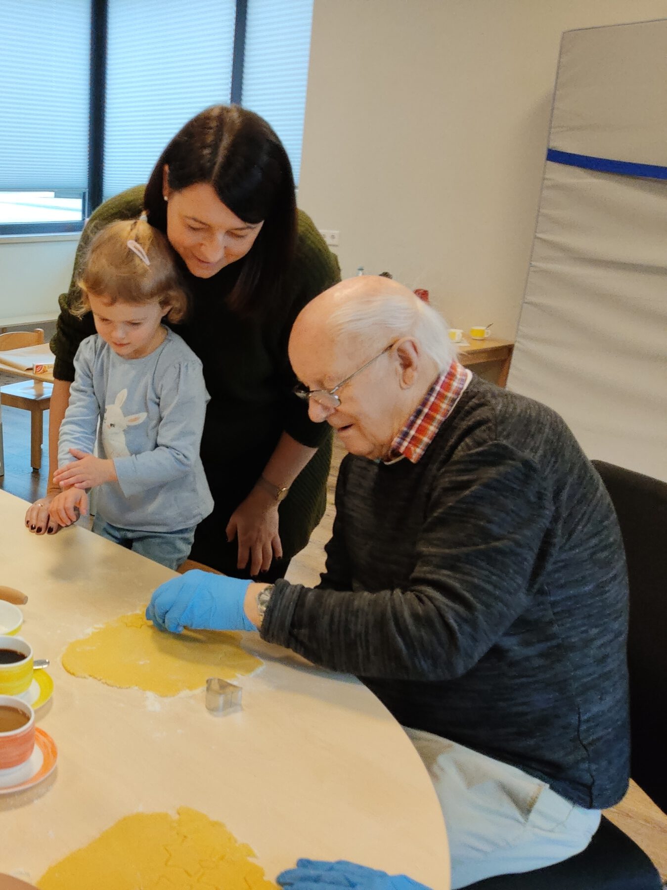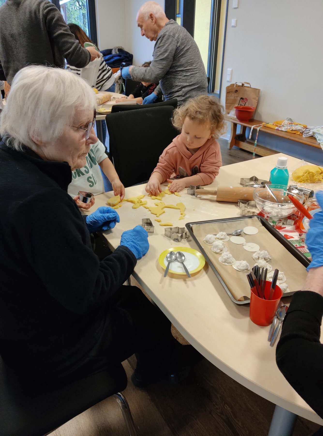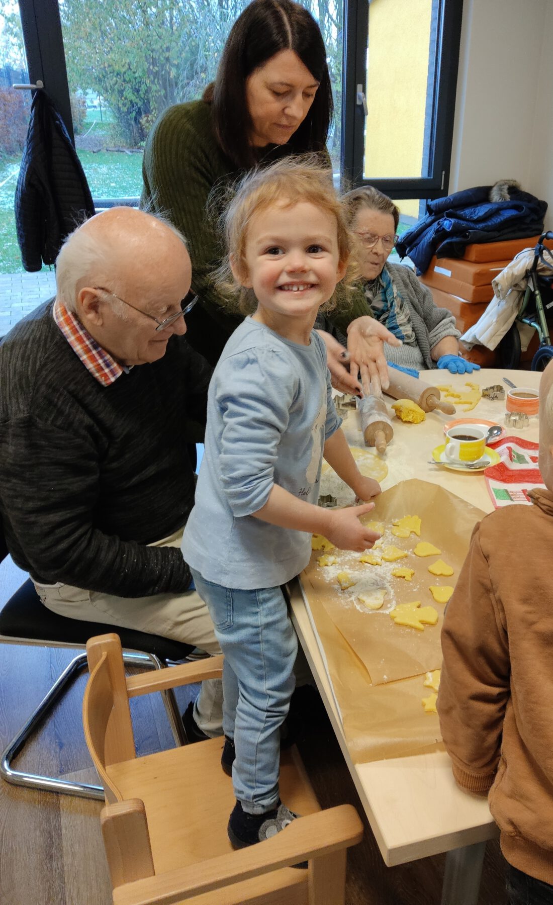 Bei gemütlicher Weihnachtsstimmung und leiser Musik rollten Jung und Alt gemeinsam den Plätzchenteig aus. Anschließend stachen sie verschiedene Formen aus, sodass nach und nach viele leckere Plätzchen entstanden. Währenddessen kamen Kinder und Senioren miteinander ins Gespräch, lachten zusammen und unterstützten sich gegenseitig. Der köstliche Duft zog durch das ganze Haus, weshalb auch weitere Kinder neugierig wurden und dazukamen.