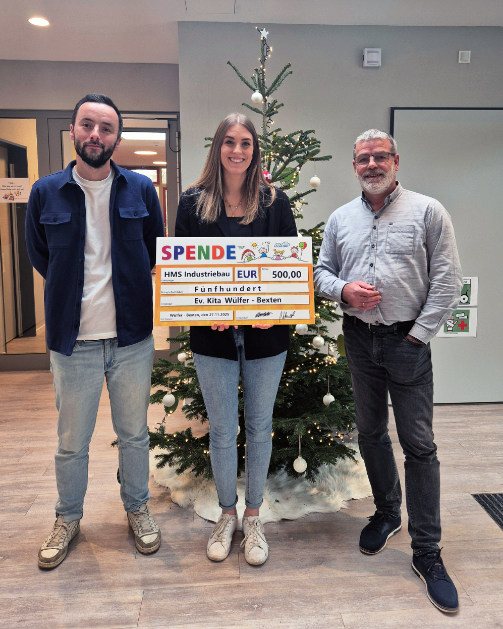 Die HMS Industriebau GmbH aus Bad Salzuflen spendete uns einen wunderschönen Weihnachtsbaum und überreichte uns zusätzlich einen Spendenscheck in Höhe von 500 Euro.